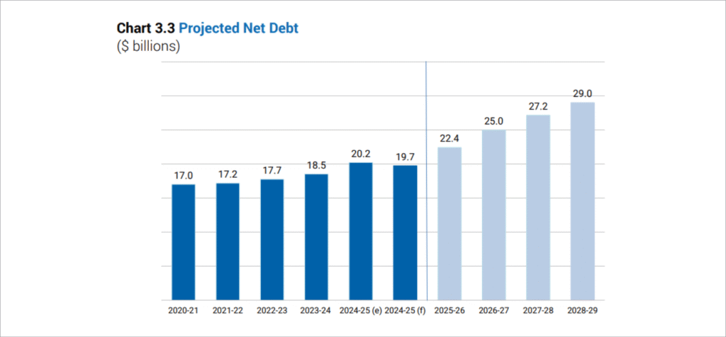 Currently, Nova Scotia’s debt sits at roughly $21B. From the time Premier Houston assumed office in the 2021/22 fiscal year to the end of this year, our provincial debt has risen by 25% from $17B to $21B and is projected to increase to $29B over the next 4 years (see chart 3.3).