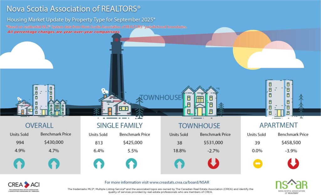 Among Canada’s 10 benchmark cities, Halifax ranked fifth in affordability, with a benchmark home price of $537,617, up 3.3% from 2023. Locally, NSAR reports that September 2025 saw the highest number of MLS® home sales since 2021. The overall MLS® Home Price Index (HPI) benchmark price for Nova Scotia reached $430,000 in September—a 4.7% increase from 2024. These shifts suggest a more balanced market is beginning to emerge.